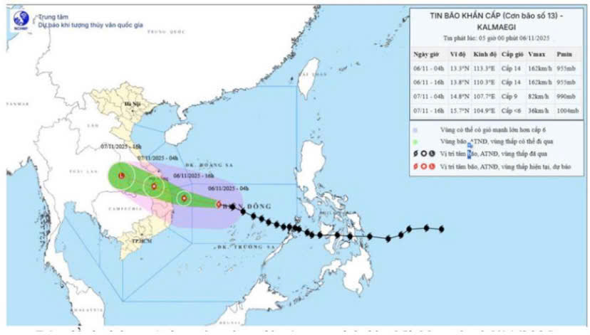 Khu vực Giữa Biển Đông gió mạnh cấp 8-11; vùng gần tâm bão đi qua mạnh cấp 12-14, giật cấp 17, sóng biển cao 5-7m, vùng gần tâm bão cao 8-10m; biển động dữ dội.